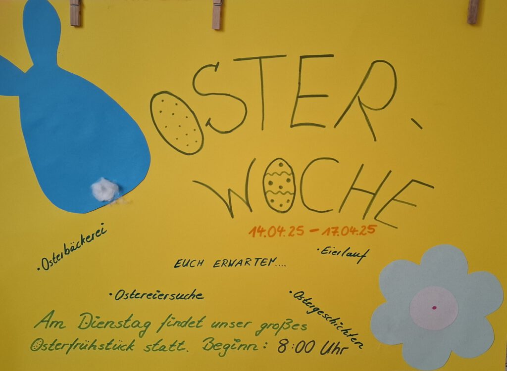 Vorschul-Osterwoche Von adminAm 02.04.2025 Auf die Vorschüler wartet eine aufregende Osterwoche, mit vielen verschiedenen Aktivitäten!